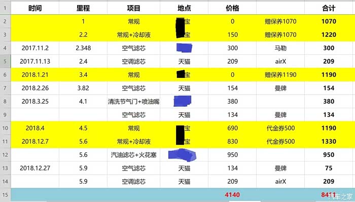 4、表格有个问题,最后一次的空气滤芯是双十一买的马勒,优惠完150元两个,表格价格我写错了,懒得改了。