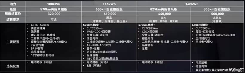 考虑了两天选哪个配置,最终选择650旗舰四驱,其实心里一直想着140度电池版本的,无奈140度电池差价8万,感觉这8万干啥不好,跟116度电池常规续航里程开差个100公里最多,低配版本140度的又只有单电机,没有三排腿托什么!想着这车以带娃出行旅游为主,也不可能一路长时间开,舒适性一定要好,双电机四驱动力不错,单电机超车可能有点累,四驱模式在雨雪天相对比较安全不容易打滑,就选择650旗舰四驱了!期待下个月新车的带来,五一可以带娃周边走走