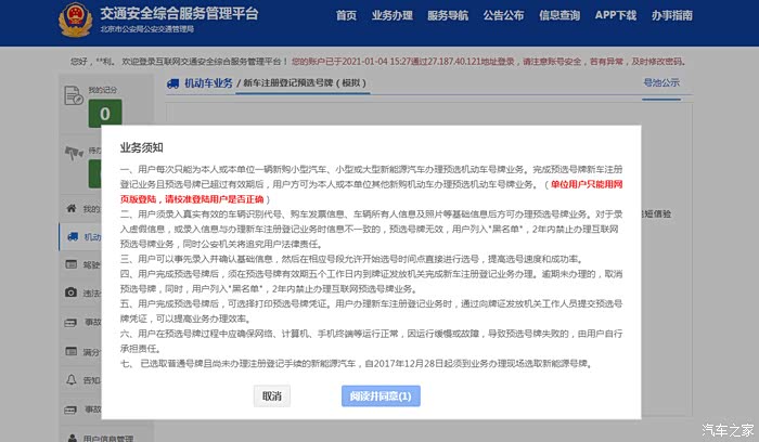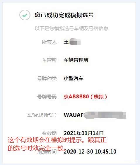 这里还要注意一点:如果在网上选好了号码,但是又想去车管所碰碰运气,那么只能等到选的号码失效以后,也就是等15个工作日之后,再去车管所,并且之前网上的号码也不能用了。