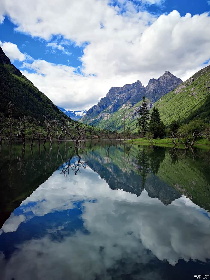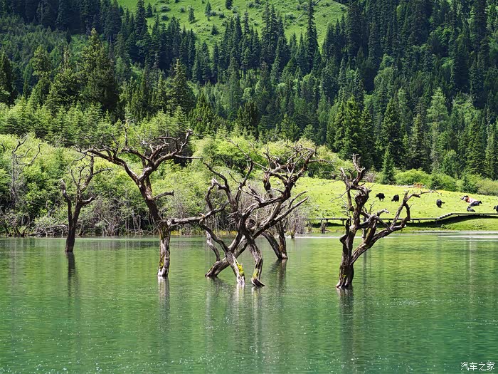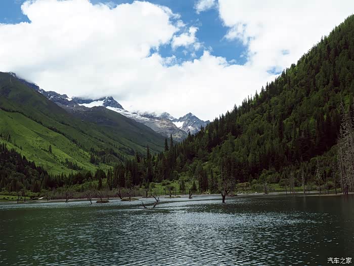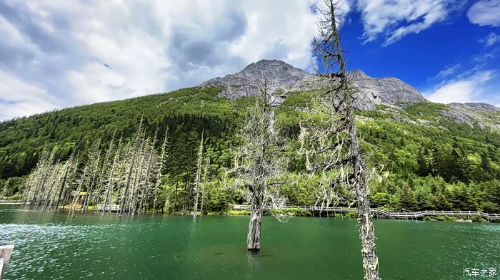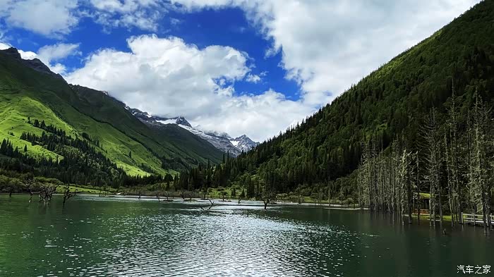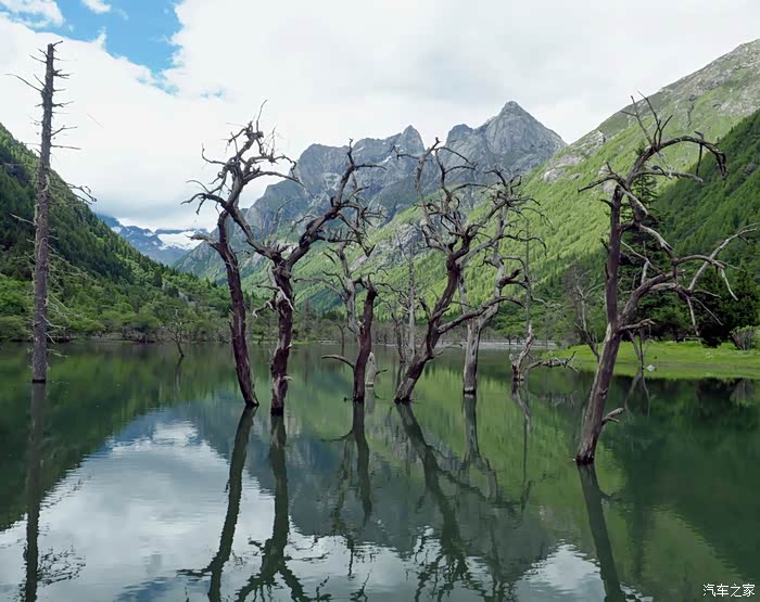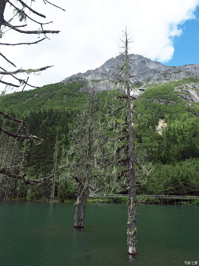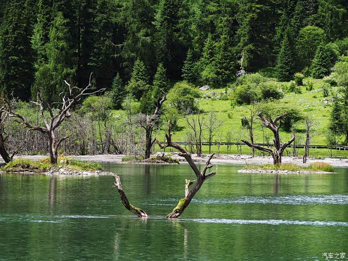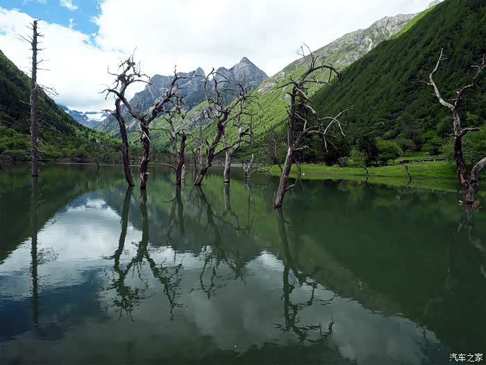 这是一个因泥石流冲击而自然形成的堰塞湖,湖水清澈,枯木老树静立,湖水中山体、沟壑、雪峰、奇岩倒映,树木、草地环绕,异彩纷呈,美不胜收。