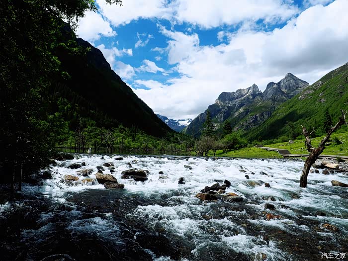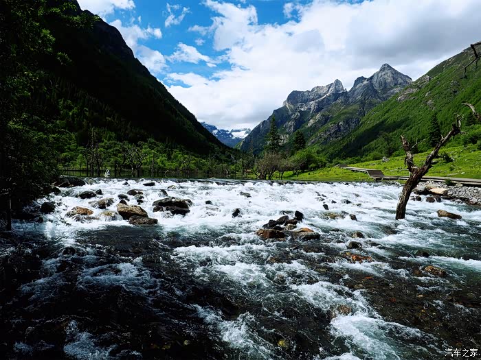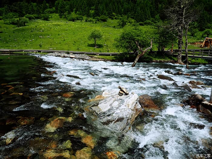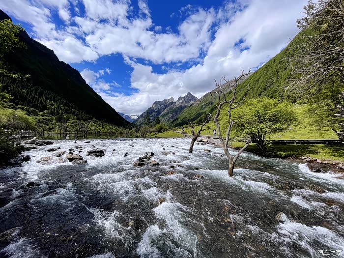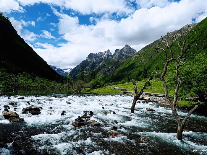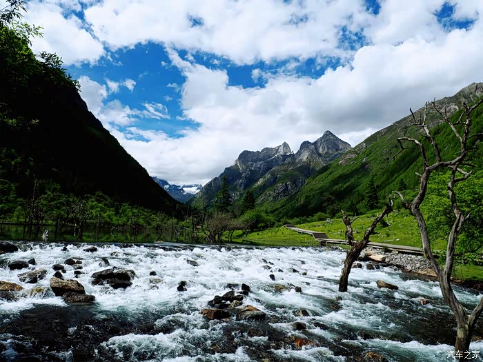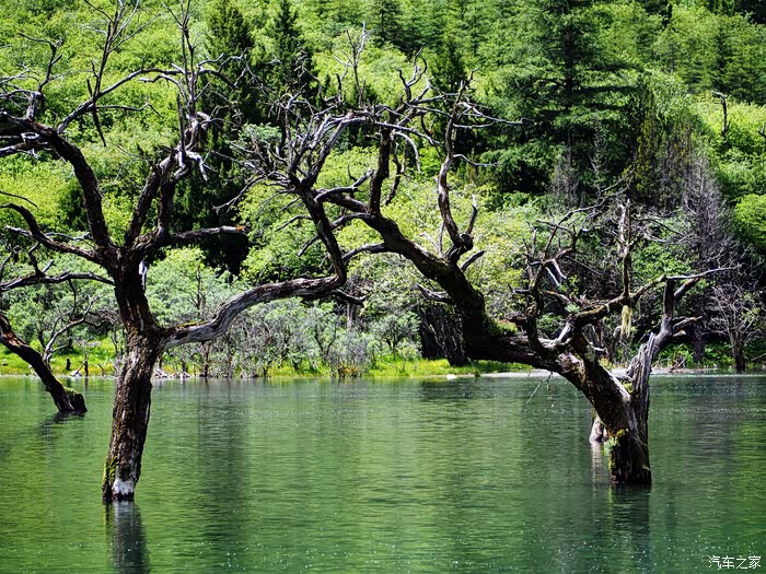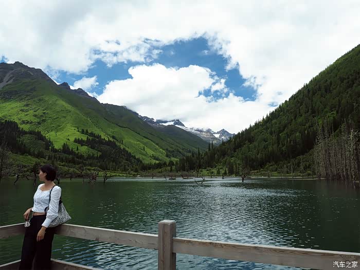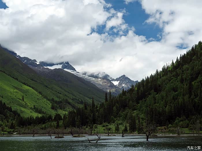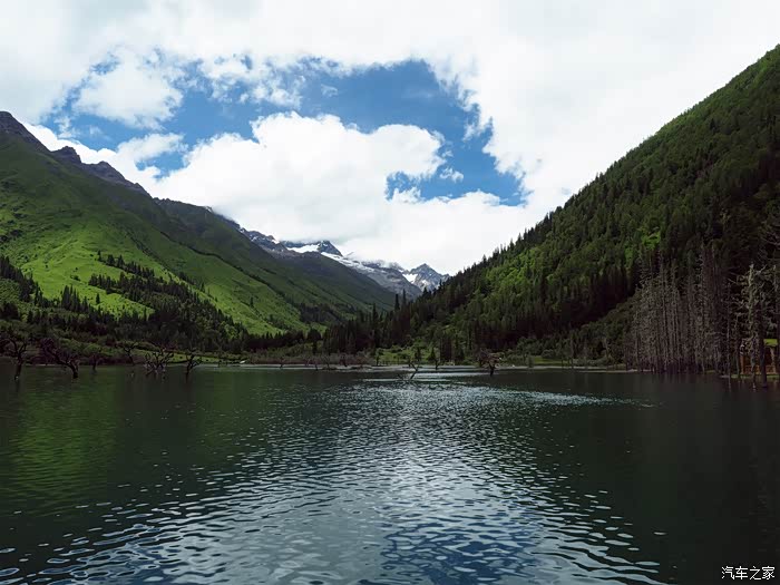这是一个因泥石流冲击而自然形成的堰塞湖,湖水清澈,枯木老树静立,湖水中山体、沟壑、雪峰、奇岩倒映,树木、草地环绕,异彩纷呈,美不胜收。