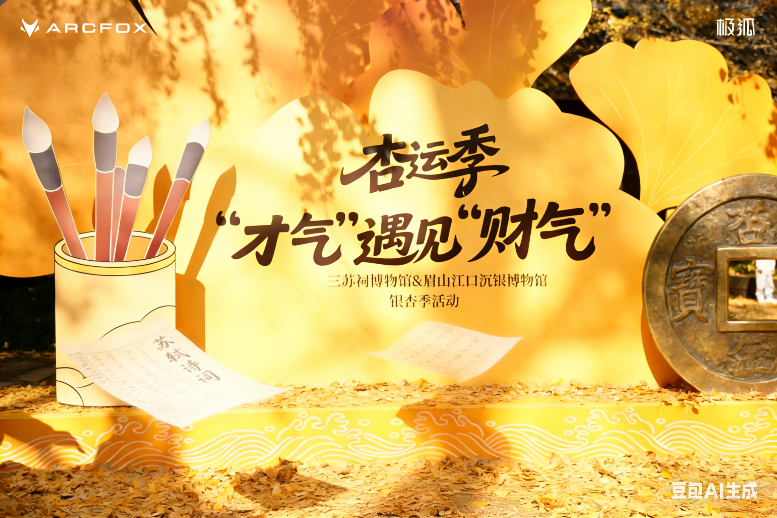 红墙黛瓦前,那只用银杏叶堆成的“苏小咪”萌得犯规!打卡牌上写着“杏运季·才气遇见财气”,把三苏的文墨雅韵和江口沉银的金辉合在一起,抱着极狐车活动牌和“苏小咪”合影,朋友圈直接被问爆地址!