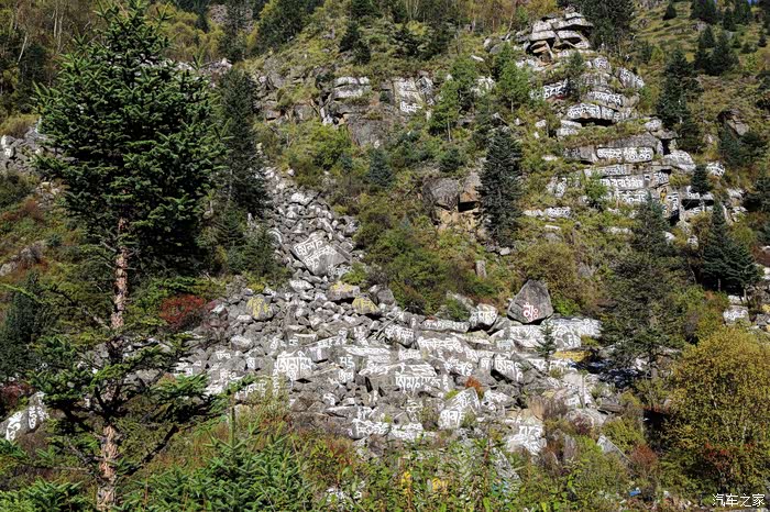8:08 启程。从小镇穿行上G318,行驶4公里右拐驶入S215塔公方向。路好,车多,沿立曲河而上,河滩上、河岸边、山腰的石头上,画满了五颜六色的六字真言,甚是壮观,特别吸引眼球。加之金秋绚丽的风光,诱得一路频频停车拍照。