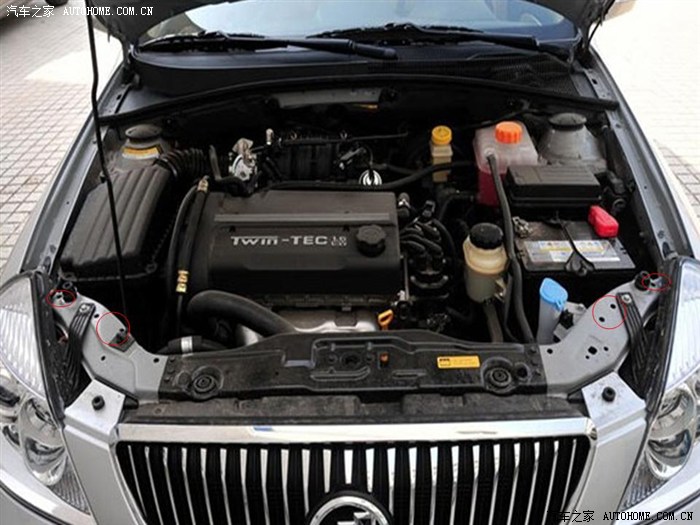 这个是刚到网上找的发动机仓全景,晚上忘了照了,大灯上方标红色椭圆的地方为外侧调节位置,调节大灯高低,标红色圆圈的为内侧调节位置,调节大灯左右;