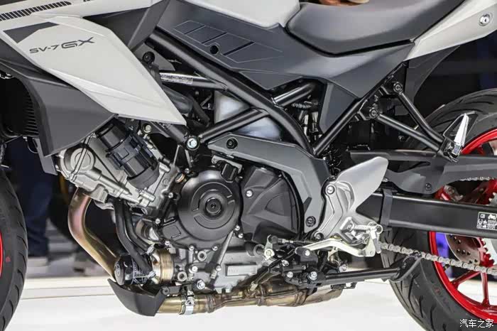 动力上SV-7GX搭载一款最新的90°夹角V形双缸水冷引擎,实际排量增至645cc,具备54kW/8,500rpm的最大功率和64Nm/6,800rppm的最大扭矩,最大马力为73匹,标配滑动离合器。官方表示该引擎百公里平均油耗约为4.3升,配合17.4升的油箱可以提供300公里以上的续航表现。