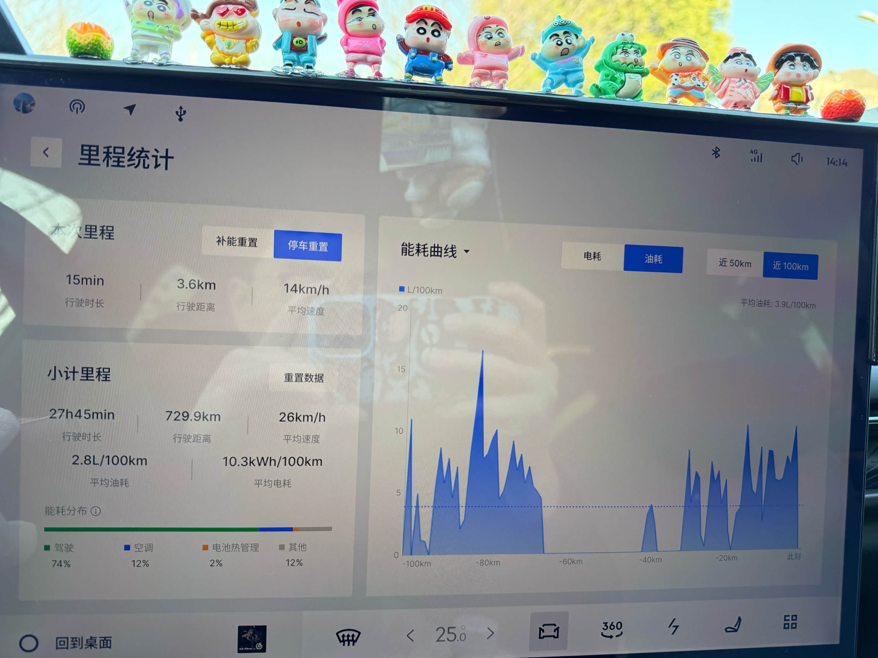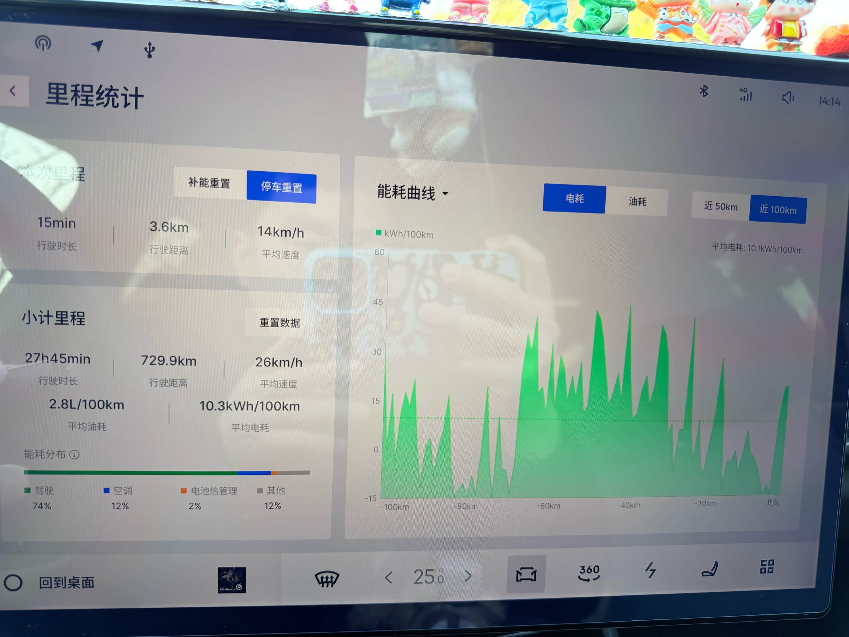 再聊聊大家最关心的能耗表现,25000公里的行驶数据,让我对领克07的节能实力有了实打实的感受。作为插混车型,它的油耗表现格外亮眼,综合下来平均油耗仅2.8L/100km,即便是油耗波动的路段,近100km的平均油耗也不过3.9L/100km。对比同级别燃油车,这笔油费的节省可不是小数目,日常城市代步基本靠电,长途出行用油也毫无压力,彻底打消了我对“油耗高”的顾虑。