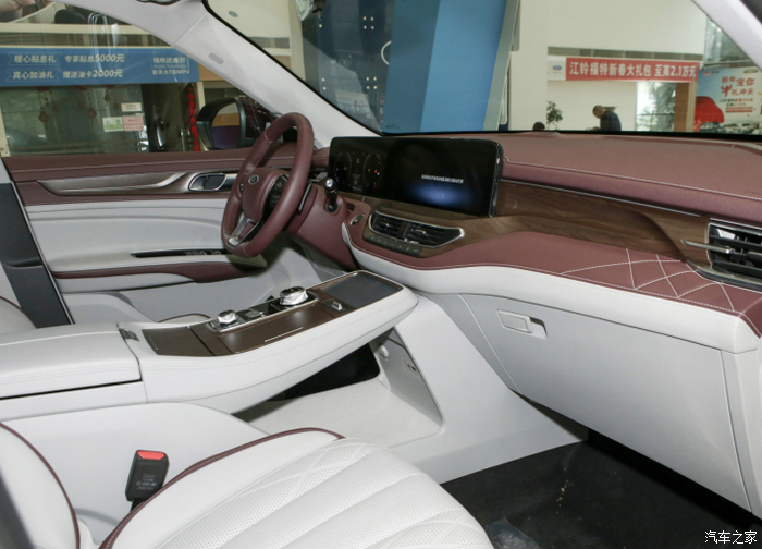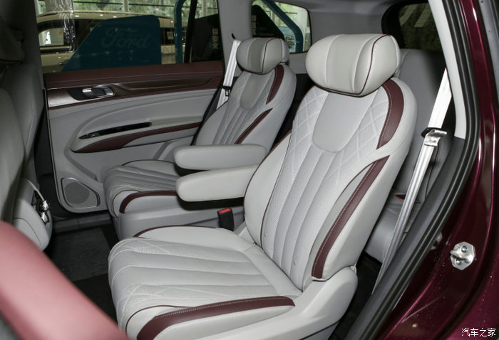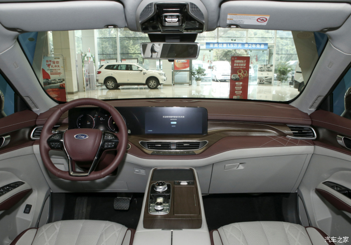 内饰风格比较素雅,同时图中也是高配版本,相信配色上会和未来的低配车型有很大差异,实木风的饰板加上棕红色的点缀,主色调还是白色,有点美式的风格。领裕的前排储物空间比较丰富,从图中来看,旋钮式电子挡把看起来有科技感的同时也节省了一大部分空间,前部是能够放手机的托盘,右侧是两个杯架,后部还是一个储物格,中欧哪个台的下方也是一个敞开式的储物格。