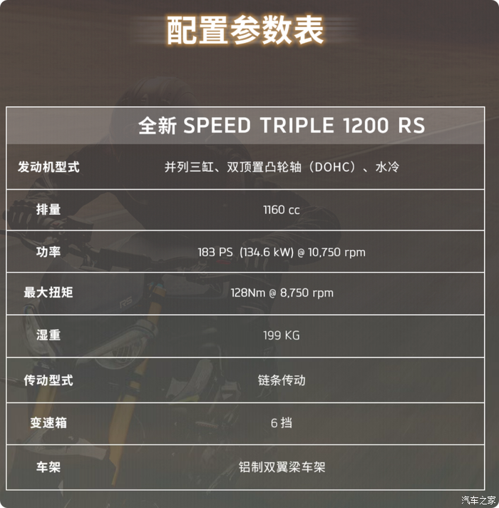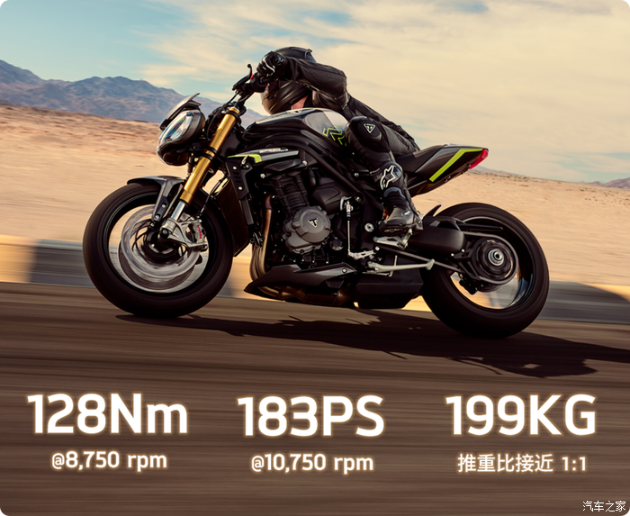 整备重量199kg,马力183PS,推重比接近1:1!想必各位车友大神一定能够“轻松驾驭”。凯旋Speed Triple 1200 RS采用了全新1160cc并列三缸发动机,并且汲取了Moto2赛事技术。参数上,该发动机在10750rpm能够爆发出 183PS(134.6kW)功率,在8750rpm输出 128N·m最大扭矩,拧油即可抬头。在这里就不弹极速,因为极速需要看各位在封闭路段的胆量了!