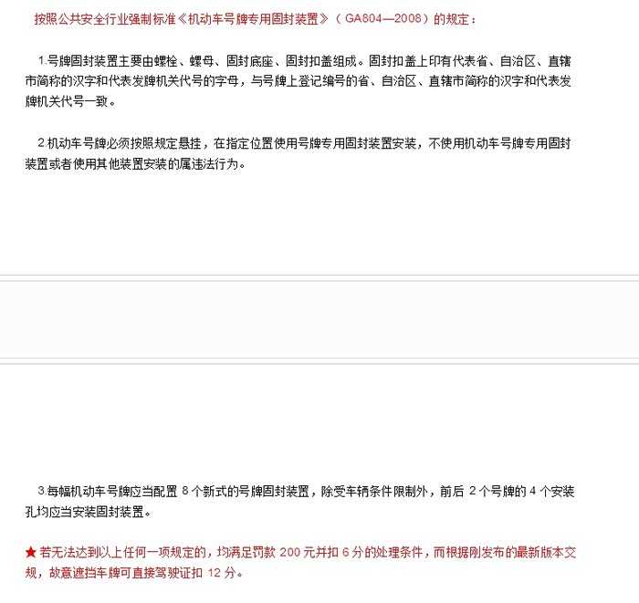 回答:公安部于2010年就明确规定,除受条件制约外,每块机动车号牌要装4个固封螺丝,以免车牌脱落、歪斜。也就是说,符合安装4个螺丝的车辆,应按规定安装,不按规定安装的将记12分、罚款200元;但如果是因车辆构造而无法安装4个螺丝的,不予扣分和处罚。(是的,扣分罚款是肯定的啦,虽然查的不严,但毕竟是交通法规定的嘛)