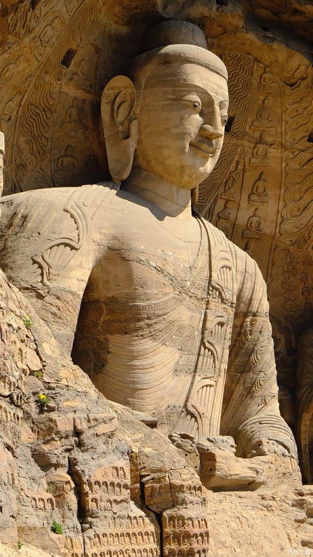 洞窟中最为壮观的就是第五洞窟的孝文帝主佛像,高达17米佛像上面有彩色颜料填充,给我的感觉又庄严震撼,又觉得美轮美奂。据说86版的西游记还在这尊佛像前拍摄过,大家有时间可以观看考证一下。但由于洞窟内光线比较暗,只有开启闪光灯才能拍出效果,所以出自于对文物的保护,没有对这尊最高佛像进行拍照。