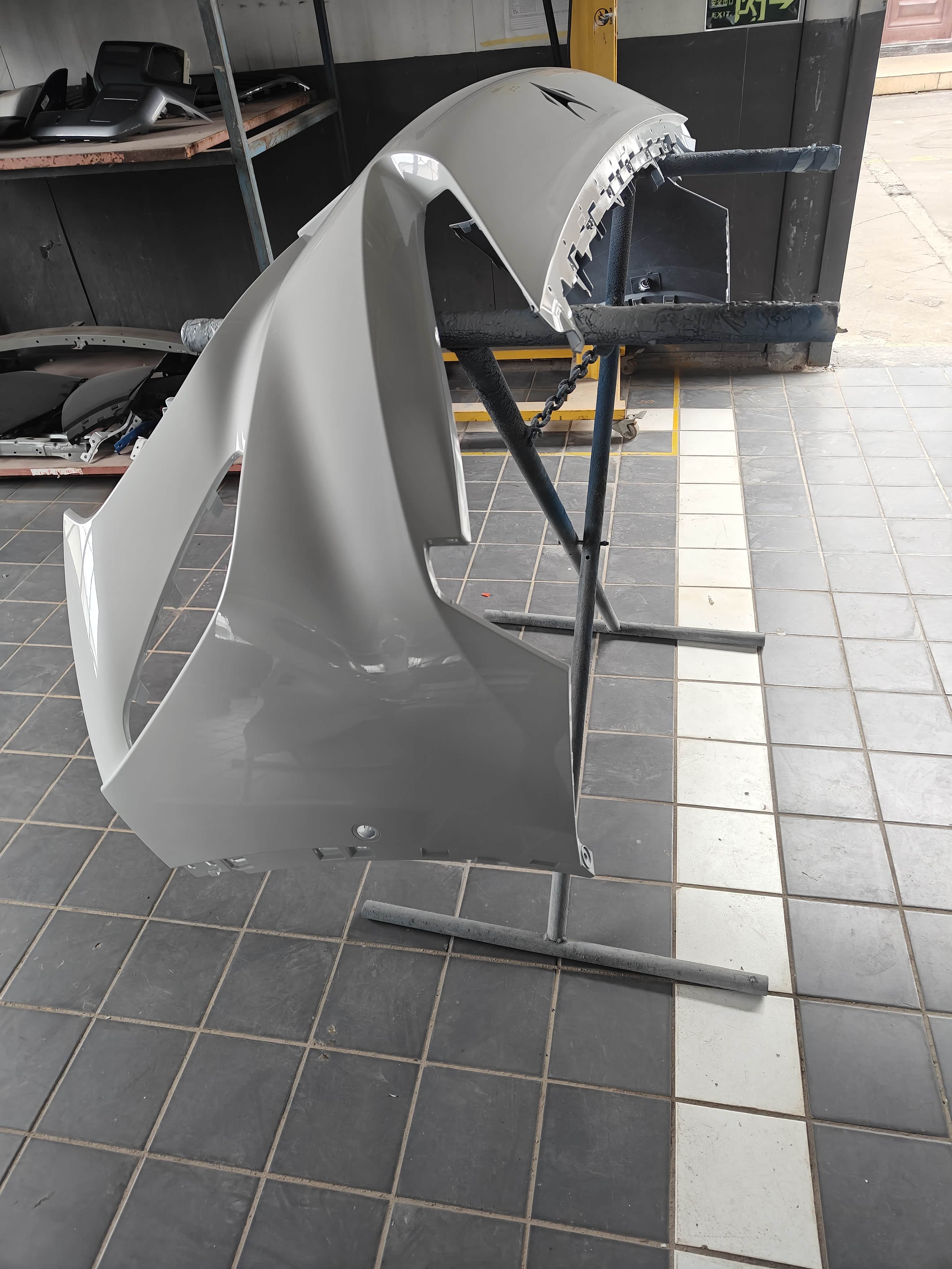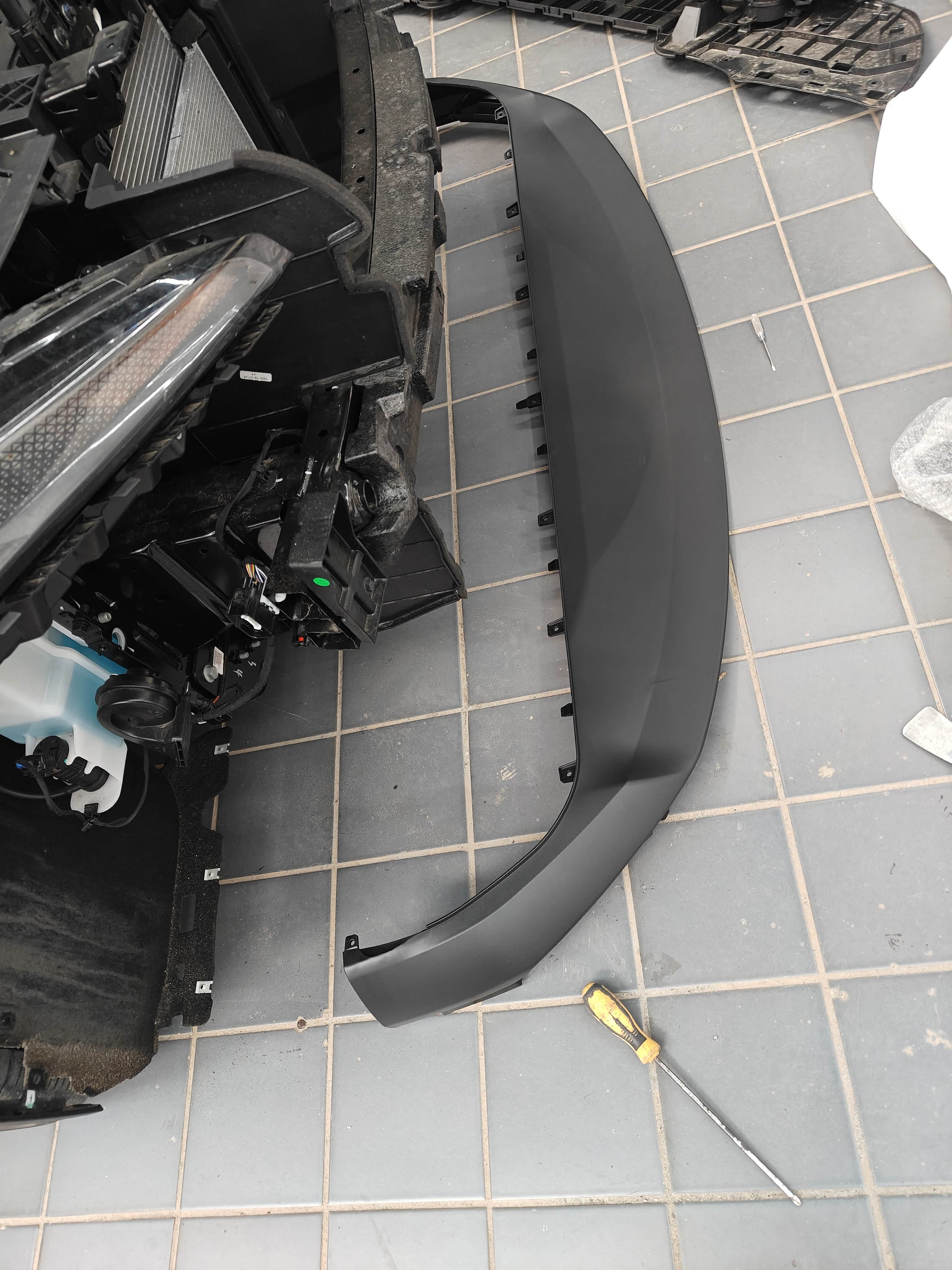 第二天我过来店里看着安装师傅把旧杠上面的东西拆下来,换到新杠上,这一步很费时间,我在旁边看着,设计的还行,都是各种卡子卡住的,也有螺丝固定,线束也是设计了固定卡扣的。拆的时候不太好搞,先打方向把轮子扭到一边,让出位置卸下安装前螺丝,两边一样,要打两次方向,还要打开前机盖,拆下中间的盖板,也是有螺丝固定的,还好不用拆大灯,反正挺复杂的,前杠的外皮其实是几个部分组合在一起得,26款是电动的进风口,这部分是两个部件,加上杠皮,下面的前唇和地板,雷达的支架,新款的风道,都是分开设计的,我觉得挺好,可以坏那个换那个,安装还算容易,拆拆装装搞了一上午,安装完还去搞了个检测,中午才拿到车,顺便混了顿饭