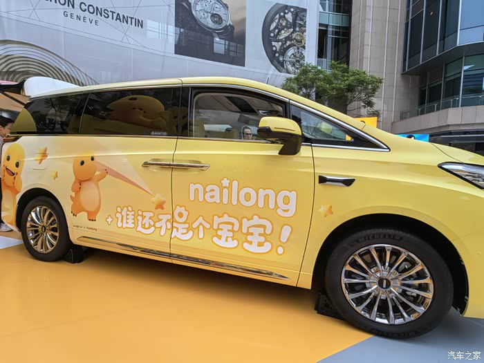 在明亮的商圈中庭,高山 7 的外观比在户外更显质感。家族式直瀑格栅在特别的显目,镀铬饰条勾勒出的轮廓既大气又不失精致,就像商圈里兼具格调与亲和力的高端店铺,让人忍不住想靠近。最吸睛的当属车身侧面和车尾的奶龙贴饰:圆滚滚的奶龙抱着奶瓶 “趴” 在车门上,车尾还有奶龙挥手的卡通形象,瞬间拉满亲子吸引力。