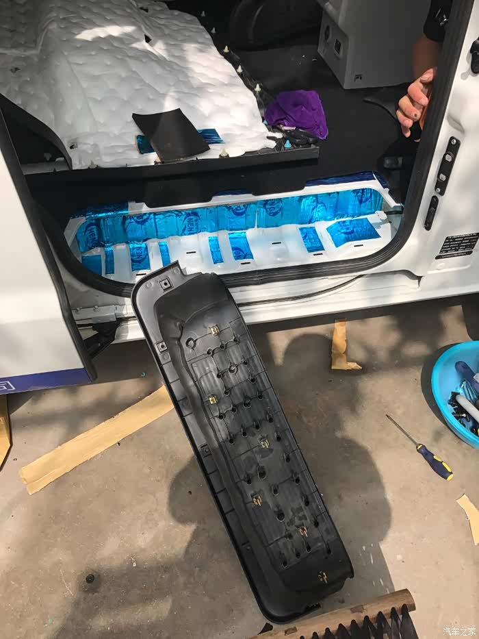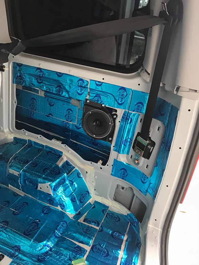 之前改装音响喇叭时,已经做过前两门的三层隔音,以及引擎盖,U型槽的止震和隔音。本次主要做针对车底盘,两侧,中门,尾门的止震隔音。