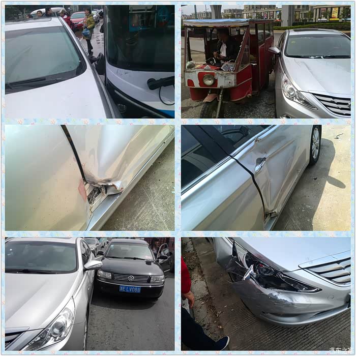 第一台车是经典的第八代索纳塔,当时国产车的品质还没起来,考虑到性价比,就买了这一款。经过了快9年的使用,证明了第八代索纳塔确实经典。外观到现在看起来也不落伍,依然觉得很好看,内饰也有特色,使用上也非常的皮实,从来没出过大毛病。一直以来都对这台索纳塔非常的满意,但是也有很大的缺点,就是隔音不行,发动机噪音非常大,隔音几乎没有。本人虽不飙车,但也不龟速,油门稍微一踩,发动机就嘶吼的非常明显。多年的使用里,经历过很多碰擦事故。和公交车干过,和面包车干过,和三轮车干过,和小轿车干过,和SUV干过,还和花盆、树木都干过。但好在都没有伤筋动骨,也没有危及到人身安全。所以买S90的时候就是考虑到主动安全配置比较高,很多碰擦其实如果换成S90的话都可以完全避免了。下图展示一下惨痛回忆。