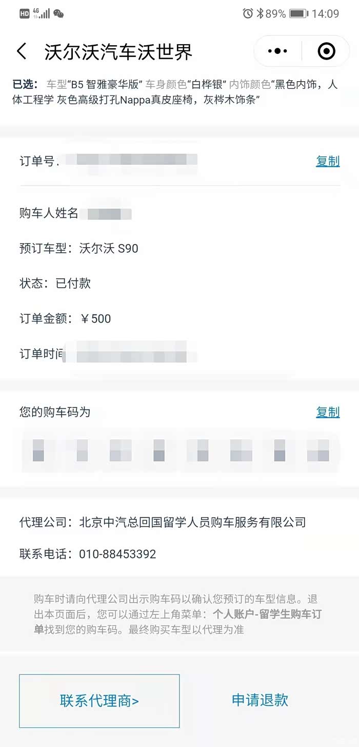 闲话不多说了,下面就上图吧。下图是在沃尔沃官方微信小程序上的订单,先交500块钱。