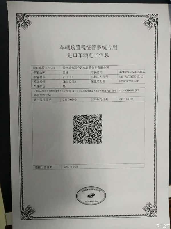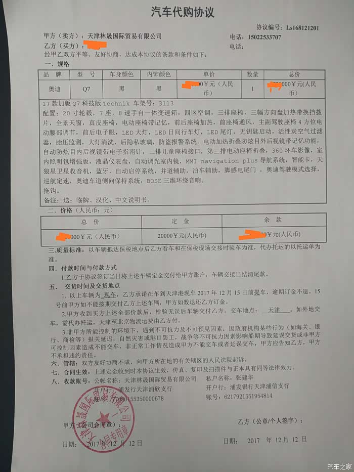 经常留意Q7论坛里的新用户发的用车帖子,看到论坛里有在天津港提的车,关于平行进口车还是有点了解,之前的一个同事做过类似的生意,都知道天津港水比较深没有一个靠谱点的销售不敢轻易涉足,有一天在论坛上看到大白胖子提大白的帖子阐述了天津港提车的经历,并在下方的评论区里看到一些对张总评价都不错,2017年11月15日加了张总的微信简单聊聊现有车型及配置,得知Q7加版科技版性价比高,随后看到朋友圈发的提车视频及斗鱼直播间回答大家提出的问题,都比较实在,也有从张总提过车的车主都对张总的诚信竖大拇指。经过一个月的关注与12月12日确定了17款科技版,先发定金留车。15日早上去张总那提车,从结识张总到提车整一个月。