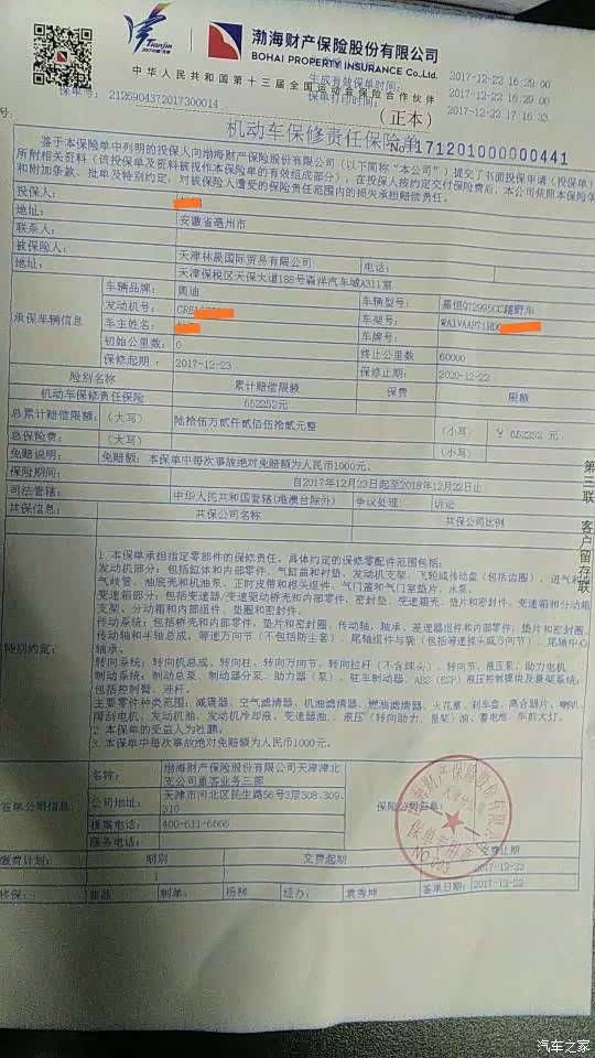 总结:第一次买好一些的车碰上张总也是很顺利,对于天津港坑客户的事情后来了解确实存在,用一句话来说就是不要贪便宜,比正常价低2万以上的就要考虑了,要么在合同上动手脚,要么强制加装5-10万(其实也就是2万的东西,要把给你少的钱找回来还得再赚些)这次提车保险我自己买的(也可以在张总那里买)质保是在张总那买的省事了对比了价格也不贵,也算提的裸车了。