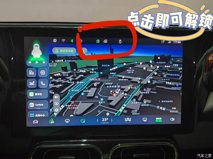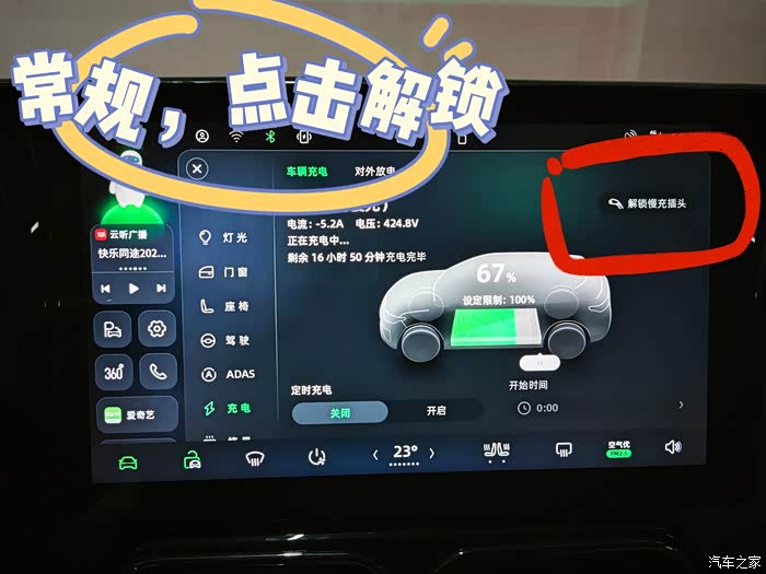 除了在中控屏幕里面解锁外,还可以使用钥匙或者手机APP点击车辆解锁按键,同样可以解锁慢充充电口。