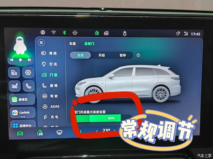 三、 后备箱开合高度设置。我们知道可以在中控屏幕中设置后备箱打开的高度,但是比较难调整到合适的高度需求。