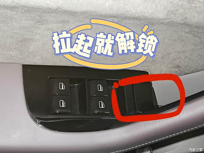 除此之外,我们还可以手动开门,如果在车内直接拉起门把手黑色方块即可。