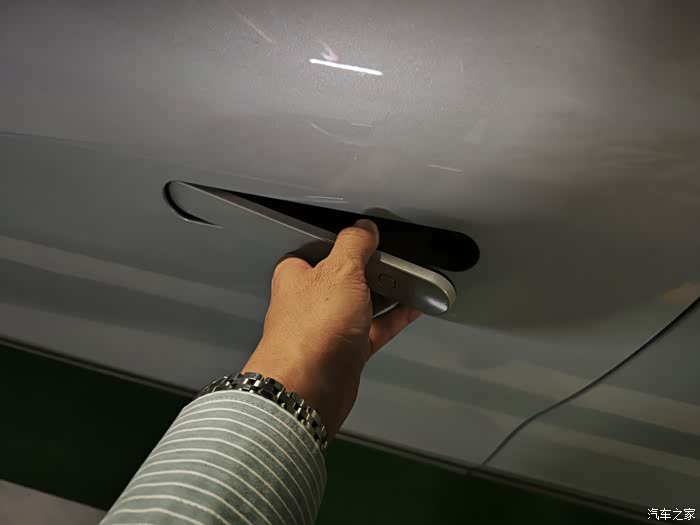 如果在车外,需要配合物理钥匙,先按前端,翘起后再拉就可以了。