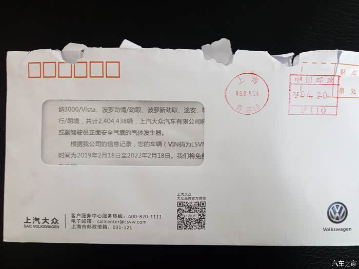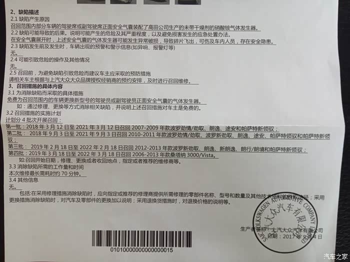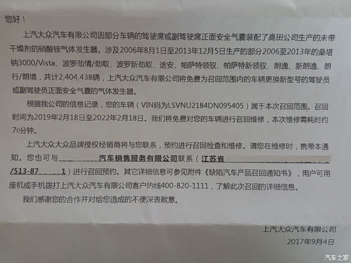 用车大概四五年吧,说是安全气囊发生器不合格,要召回更换,同样收到了厂家邮件,说要自己联系当地的4S店处理。