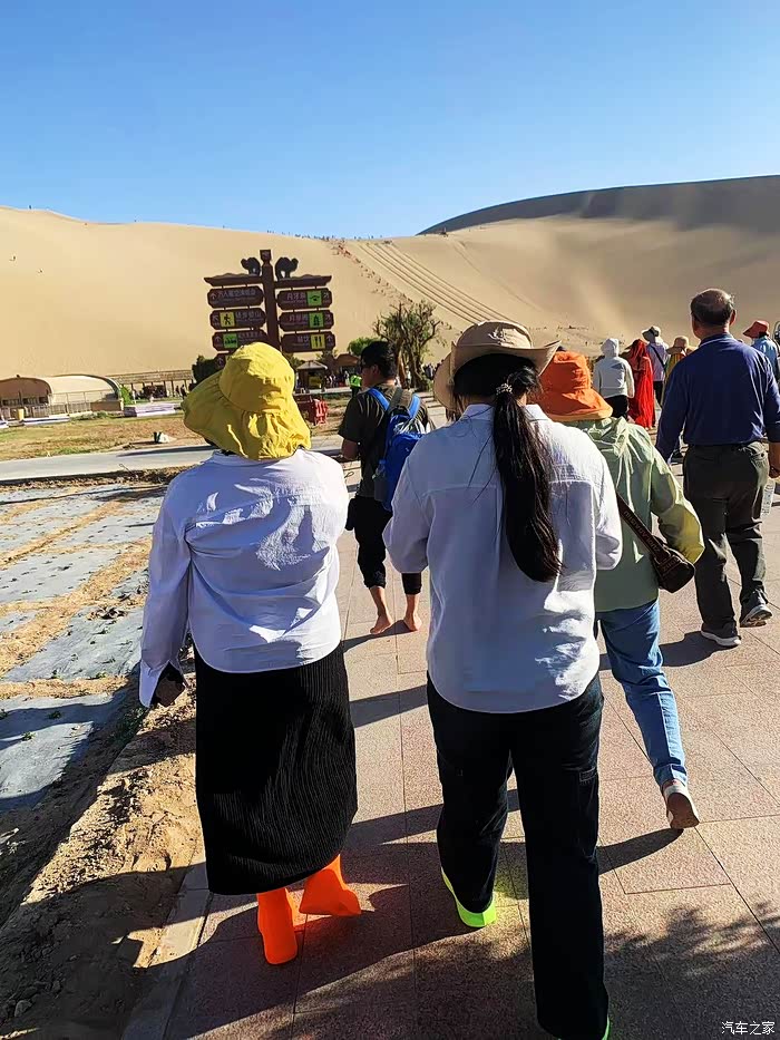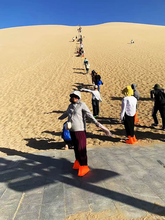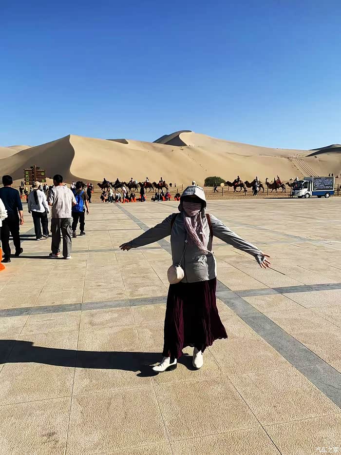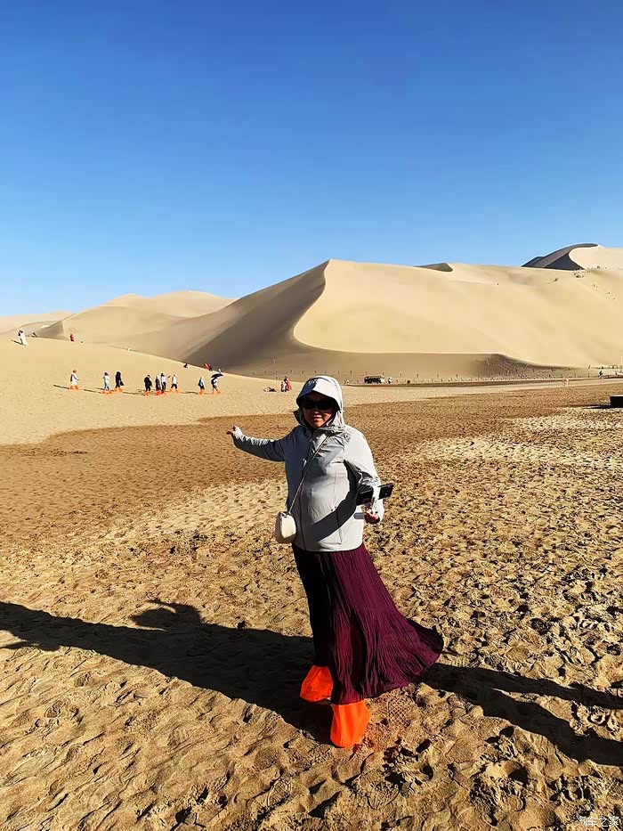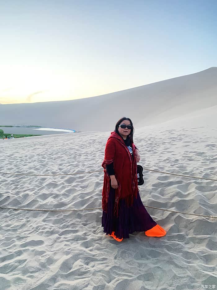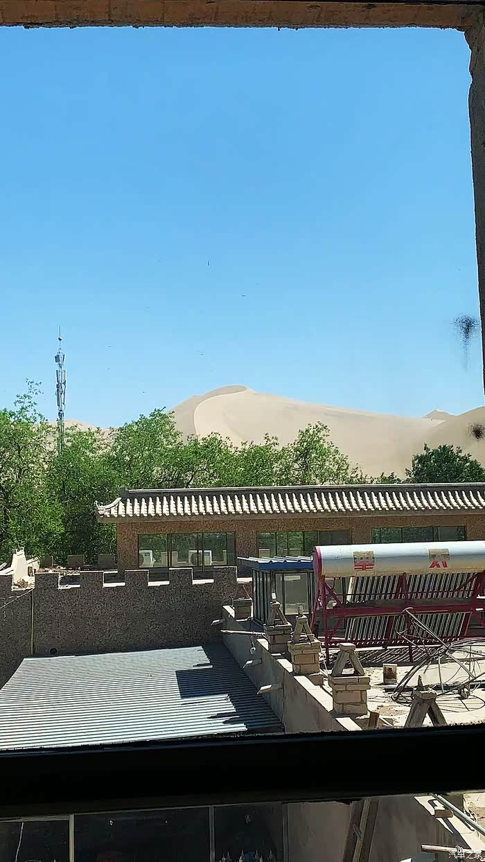 民宿就在鸣沙山下 在露台 可以看见景区 走路十几分钟 我们是6点去的景区 依然很晒