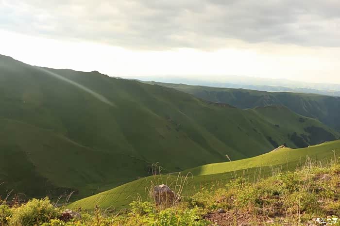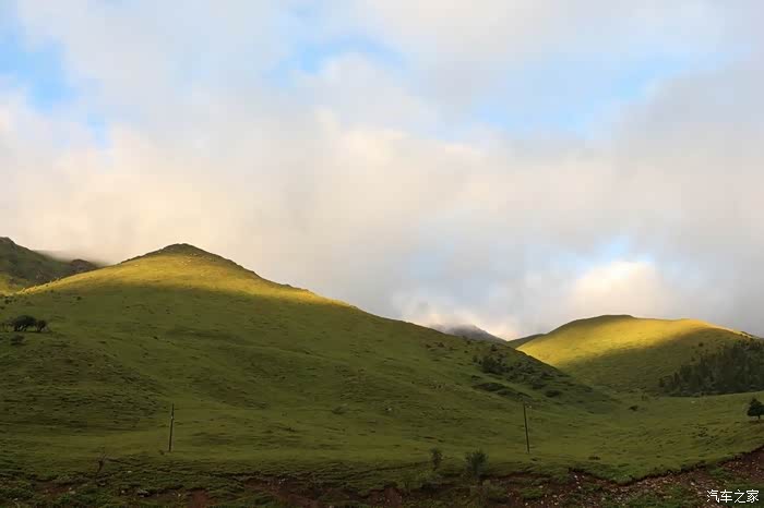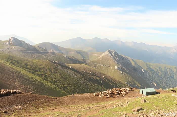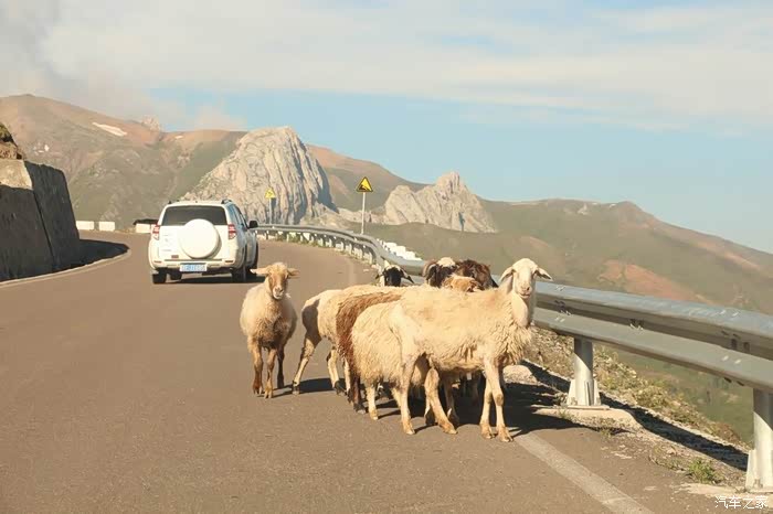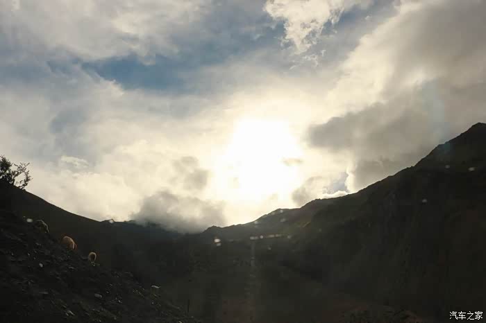 早7:20分从独库公路乔尔玛处出发,太阳慢慢升起,把高山和草甸染上一片金黄,各家的牛羊 出来觅食,依旧连续盘山路,连续下坡,路虽险,但景色依旧十分漂亮。