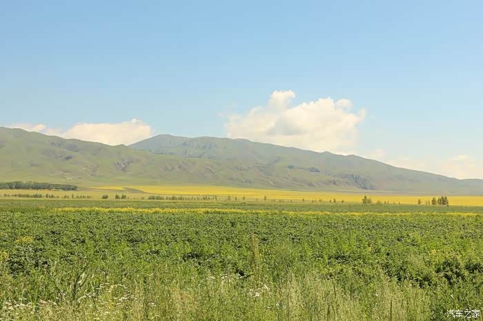 昭苏县在历史上是汗血宝马的产地,如今油菜花田遍布公路两侧,金黄一片。