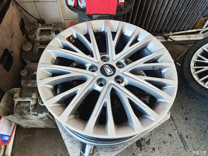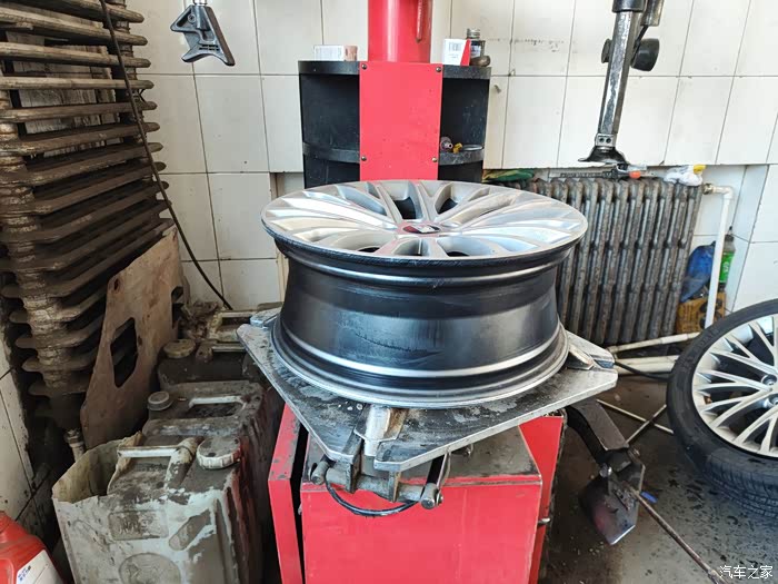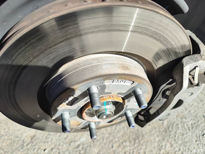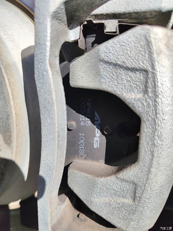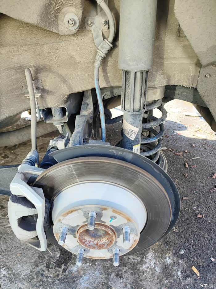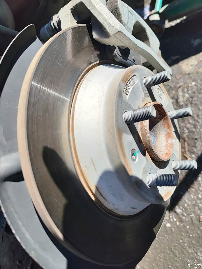 趁着小师傅更换轮胎的时间自己去外边车边检查一下刹车盘和刹车片。主要是用肉眼和手感觉一下刹车盘是否存在裂纹和凹凸不平情况,刹车片厚度情况等。