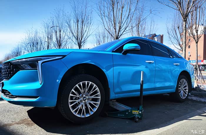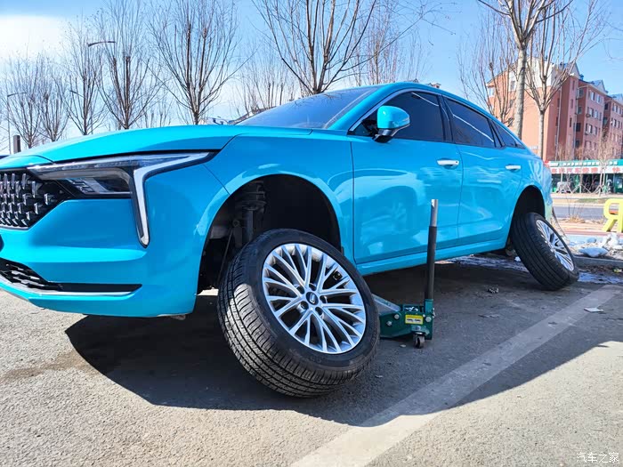 大约等候了半个小时左右,换胎的小师傅开始给车辆支千斤,换胎正式开始。