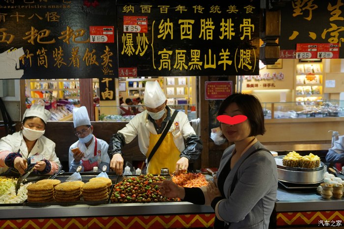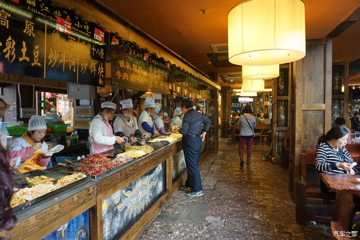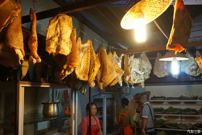 几乎是全程高速,但全是典型的山区高速,限速较低60~100KM/Hr。晚上6点左右到达楚雄彝人古镇。此古镇大部分是在原古镇的基础上重建的,且此古镇在白天几乎是没有游客的,但晚上却是游客如织。我们恰巧撞上了。先是在一家彝族饭店吃饭。看看这些厨房挂的肉就十分有胃口。