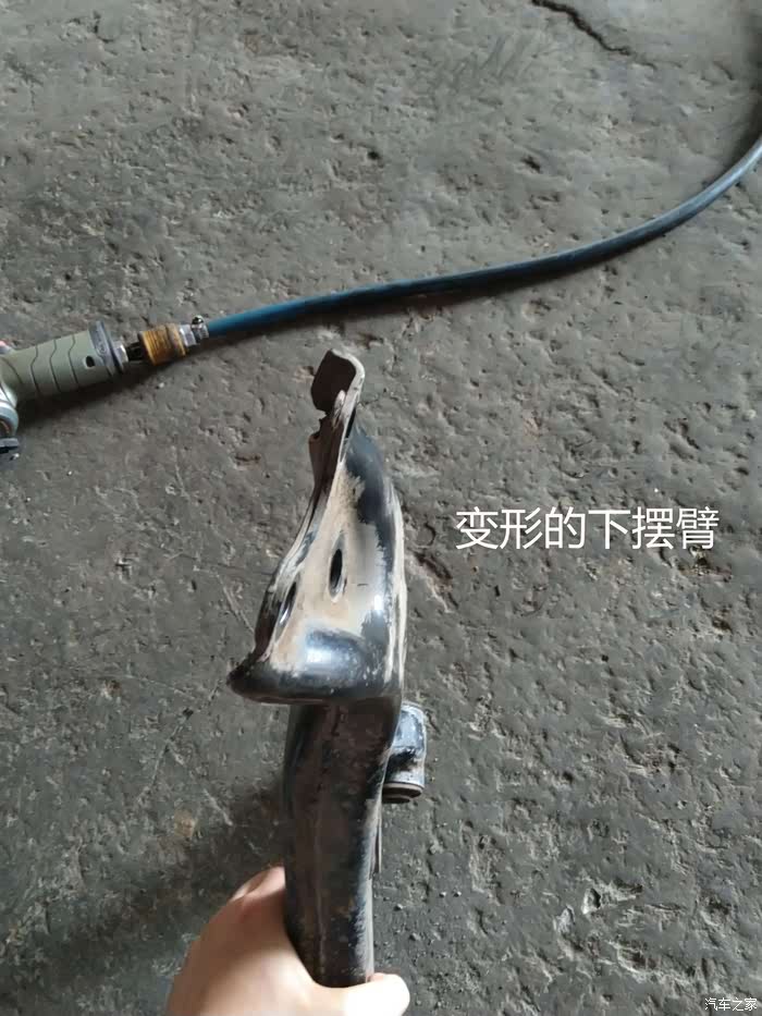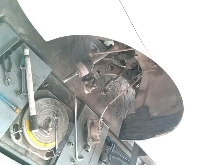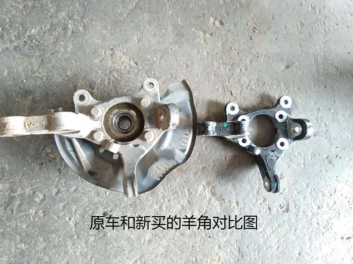 话说出厂原车配的赛轮轮胎,我一直使用了5年,18年的夏天我才更换了前轮的两条轮胎,大家可以想象一下,车辆的部件耐用程度是跟个人用车习惯息息相关的。话题扯远了,爆胎后更换新轮胎,问题出来了,左前轮无法定位,轮胎回正后方向盘向左方向偏转30-45°。外观检查发现左前轮发生移位,如下图。