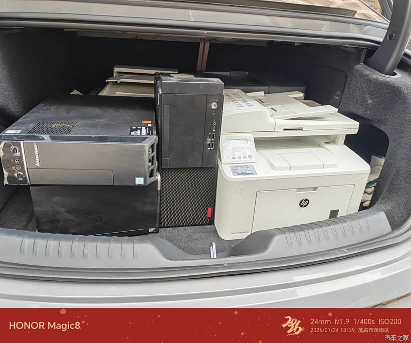 后备箱:掀背式尾门+超大开口,让惠普一体机、联想主机这些“大块头”能直接推进去,不用费力抬举。我这次装了2台打印机、3台主机,还能再塞下纸箱和线材,横向空间足够,设备之间没有挤压。