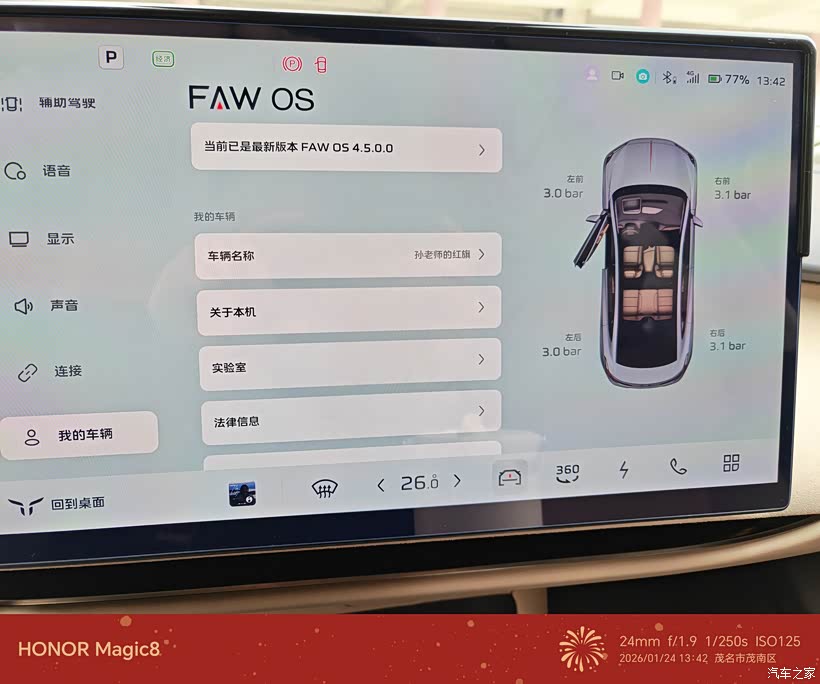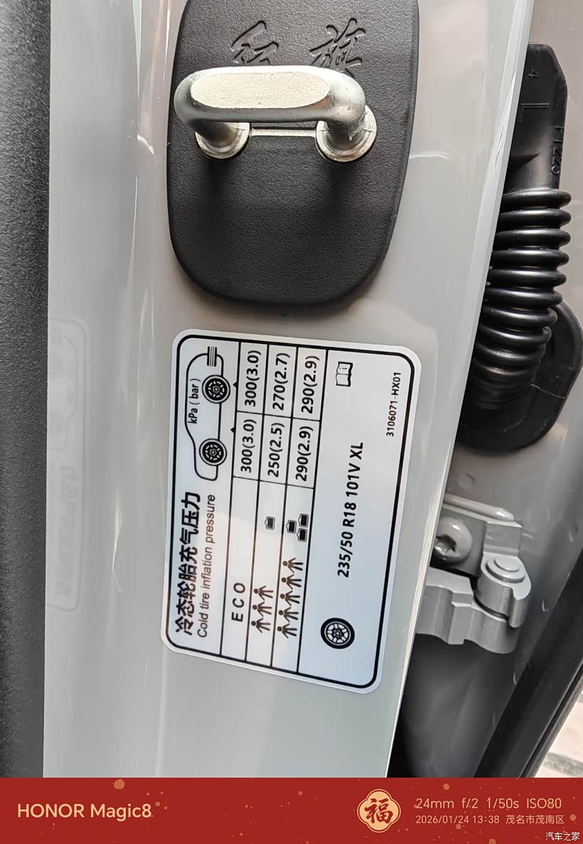 胎压显示功能全程护航,我出发前特意检查了胎压,保持在标准的3.0bar左右,满载行驶也能确保轮胎安全。
