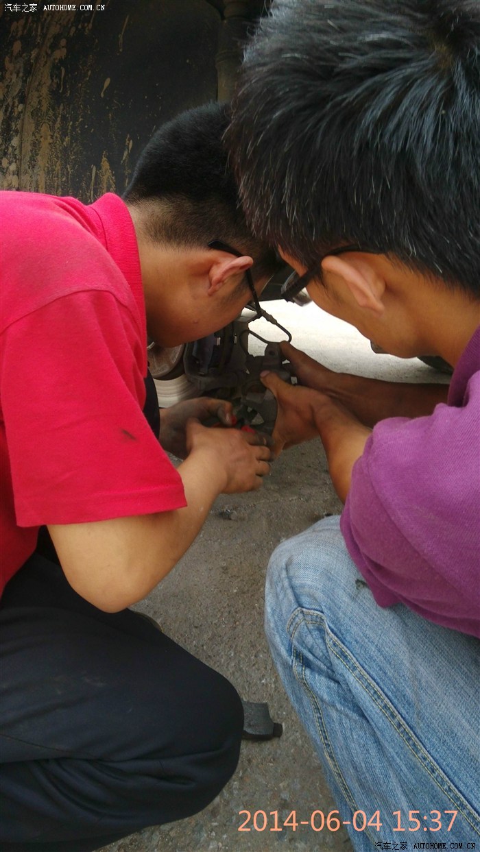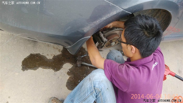 换刹车油的我在车上踩刹车,所以没照片了,,师傅负责操作并指挥我怎么踩刹车,过程就是打起火从刹车壶加入新油,上下一直踩,然后听师傅指令踩住不动,师傅一放油刹车就又踩下去,四个轮子都是这么操作的,,不知对不对呢??