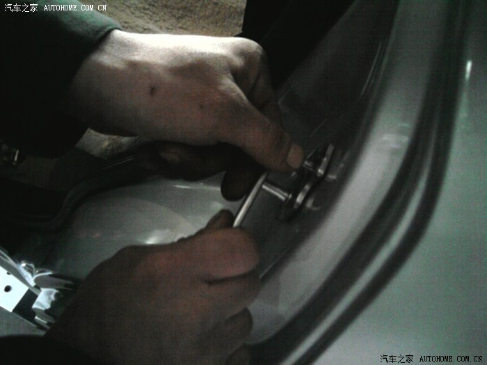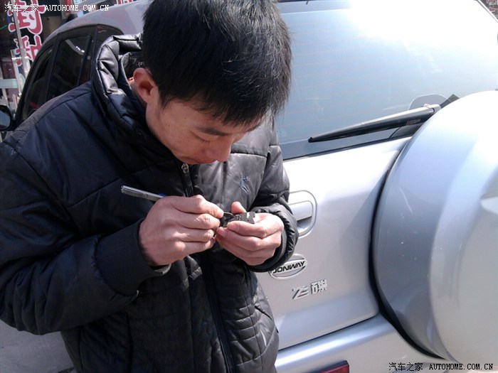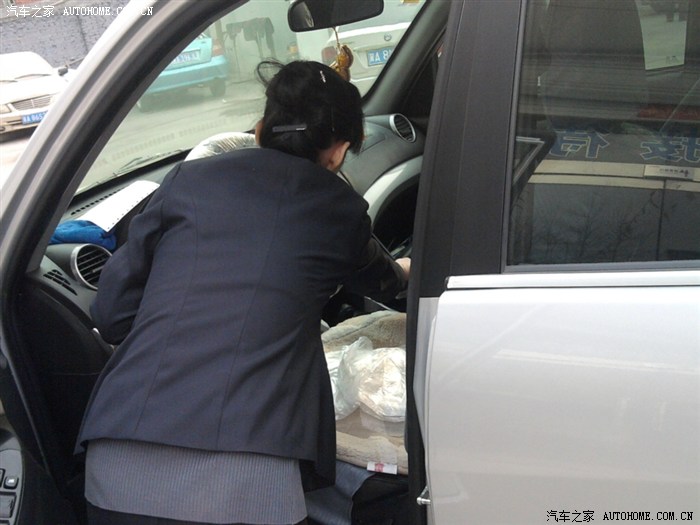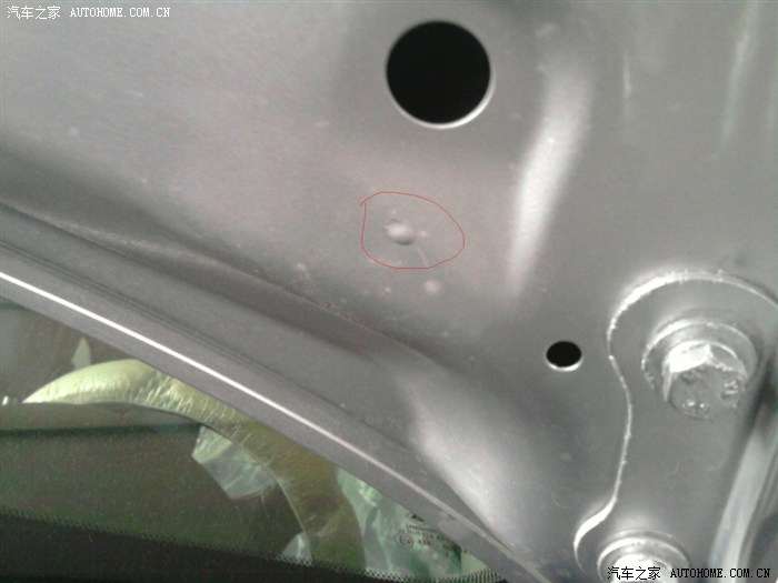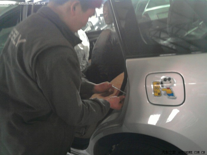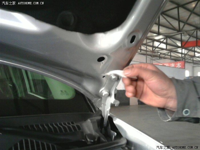 这是油漆师傅在检查俺反映掉漆的地方,有绿豆大小吧,在机盖的内侧靠近雨刮器的地方,倒是不影响美观。看来厂家要在细节处注意了。不过有厂家送的原车漆,问题很快被师傅处理了。