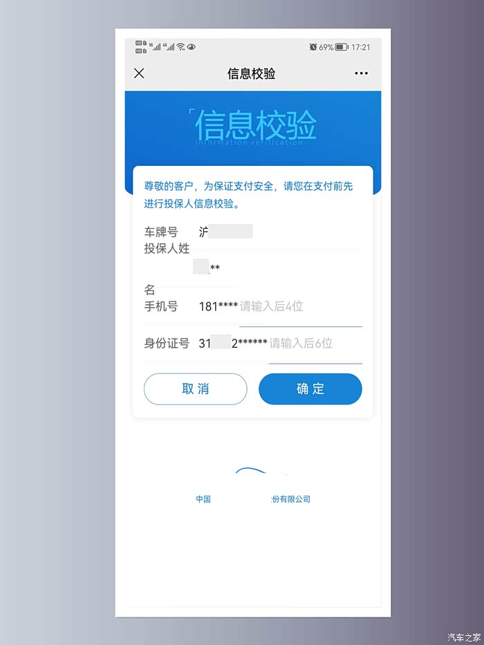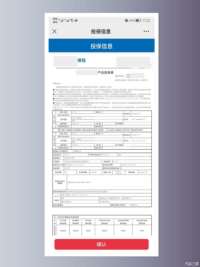 核对投保人信息、车辆信息后点击“确认”
