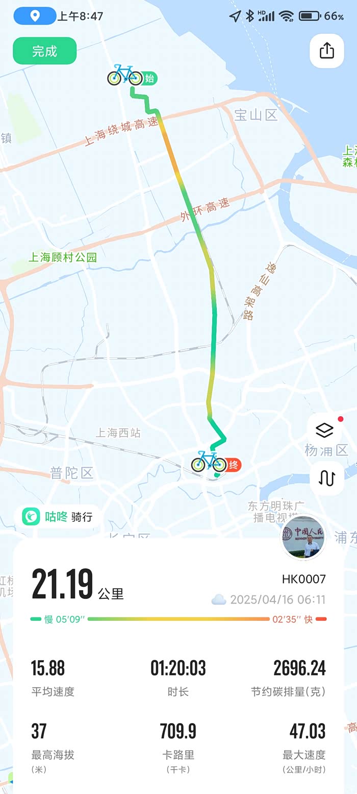 回顾下2020年时候,虽然只坚持了几个月的骑行(2020年9月-2021年1月),但依旧记忆犹新,路线是大柏树-广兰路地铁站,具体是这样的,中山北二路--黄兴路--长阳路--定海路--渡口--金桥路--祖冲之路--广兰路,浦西段和浦东段各自约11KM,不过浦东段的路好,比较平整,基本就是沿着金桥路(中环底下)一直骑行,并且后半段人烟稀少,全程(加上摆渡船)1小时20分左右,中等偏快的骑行速度。