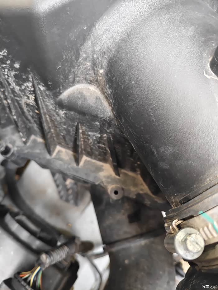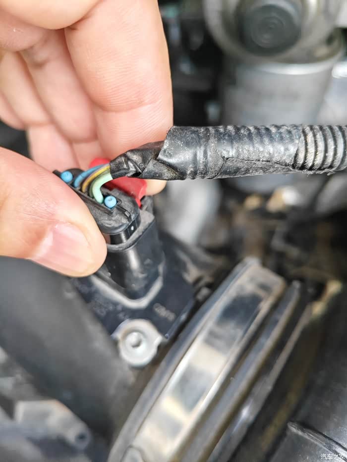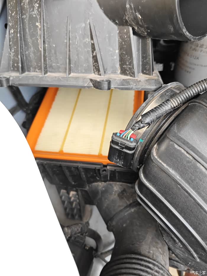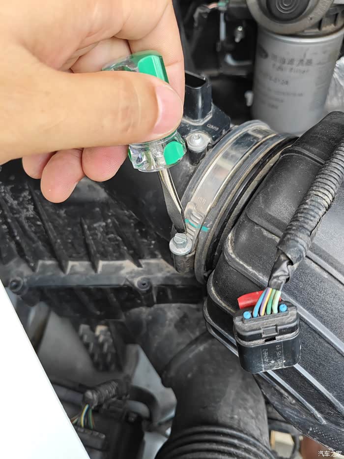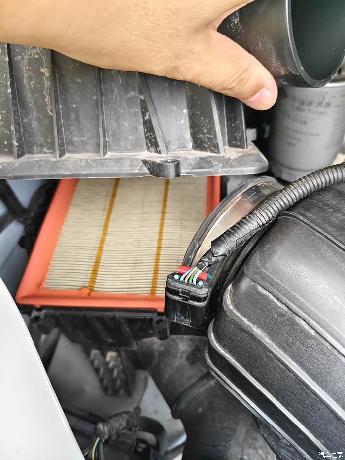 第一步拆空气滤芯,先把传感器拔下来,三颗螺丝拧掉,连接管松开拔掉,更换滤芯