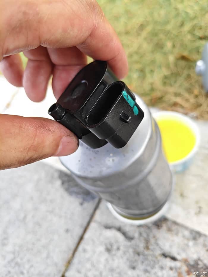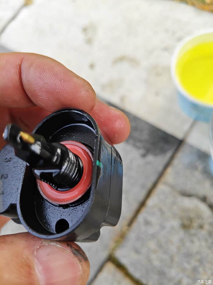 把旧的滤清器拆下来后先把油倒入一次性杯子里,然后把底部的传感器换到新的上面,注意有个黄色的垫片不要漏下了。再把一次性杯子里的油倒入新的滤清器里。