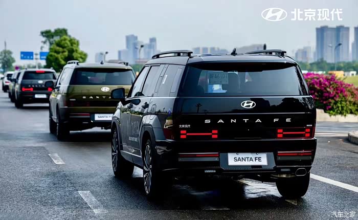 尾部设计展现出一种内敛而精致的风格。尾灯设计宽大,巧妙地安置在车尾两侧,不仅增强了尾部的视觉宽度,还提升了夜间行车的可见性。尾灯上方,笔直的线条与“SANTA FE”字母标识相结合,形成了车尾的点睛之笔,同时车尾标的存在进一步强化了品牌识别度。后保险杠中嵌入的细长反光条,不仅提高了车辆的安全性,还在视觉上增添了层次感。此外,胜达还配备了电动后尾门、感应式后尾门以及后尾门记忆功能,这些配置不仅提升了使用的便利性,也增加了车辆的豪华感。