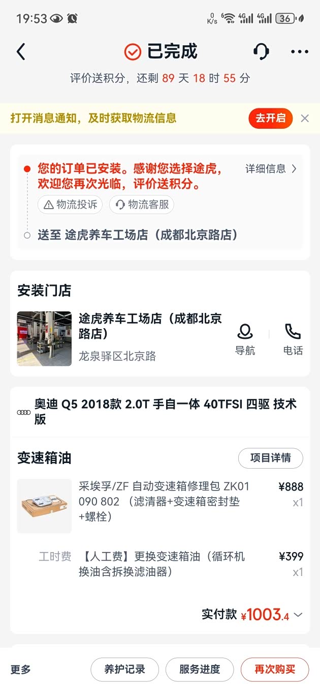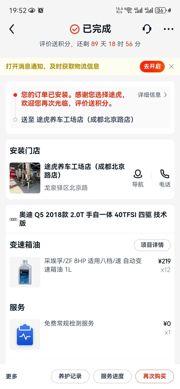 车子快8万公里了,很早的时候,大概是从6万公里的时候起吧,就开始关注论坛里变速箱油更换的贴子和京东、途虎价格了,当然4S更换方式和价格也是了解过的。今年双11看到途虎的优惠力度还不错就果断下手了。