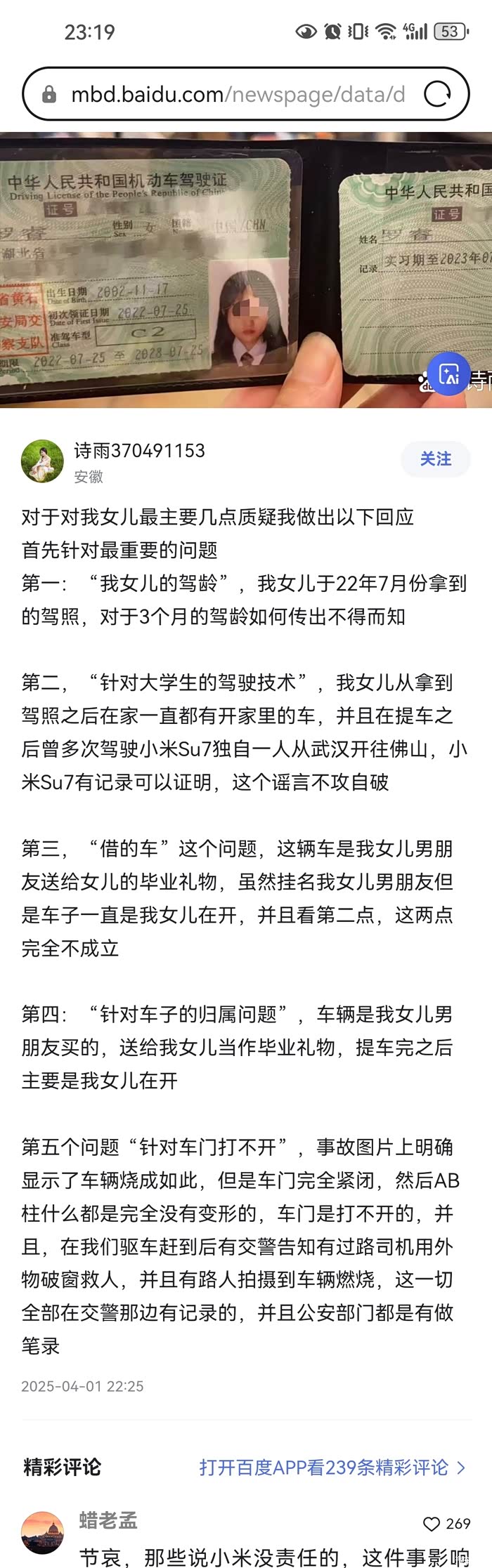 遇难者家属在社交媒体上控诉:"小米所谓的调查组究竟在调查什么?为何回避家属的核心质疑?"她透露,女儿多次向她强调智驾"方便、安全",而用户手册中"驾驶员需始终保持对车辆的控制"的条款,在实际使用中被技术宣传淡化。