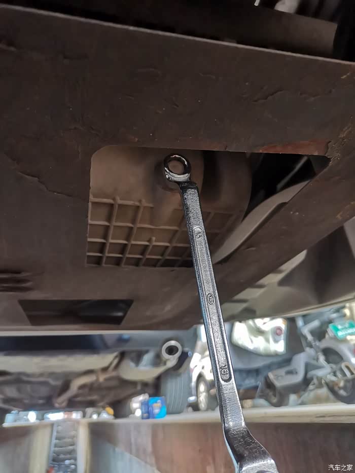 首先到地沟下面去,用准备好的13号梅花扳手,拧开机油的放油螺丝。