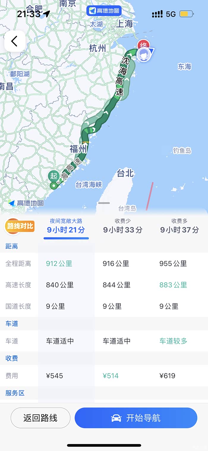 在路线选择上,我走的是沈海高速,看导航的话高速路段接近840公里。其他是城市路段。