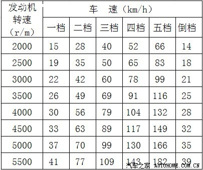 前几天忽然心血来潮,想看看自己的手动挡新爱丽舍发动机不同转速、档位对应的车速,看看几年后会不会因为磨损发生变化,于是在路上测了一下,但必须知道理论值,这样才知道自己的准不准,论坛里搜索一番,有实测的,有近似公示的,都不是很严谨,最后干脆自己找到参数计算了。以前从论坛里下载了《东风雪铁龙爱丽舍轿车维修手册+含电路图+.pdf》,里面的参数是这样的,变速器速比分别是:i1=3.417 i2=1.809 i3=1.281 i4=0.975 i5=0.764 iR=3.580 主减速器速比i0=4.286 其他计算 轮胎外径D = 轮毂的直径 + 轮胎宽度 × 扁平比 × 2 爱丽舍原车万力轮胎型号185 60R14 轮胎外径D=25.4*14+185*0.6*2=577.6mm,这样车速就可以用以下公式计算:车速=发动机转速/(变速器速比*主减速器速比)*πD,最后我列了一个表如下,车速换算成km/h并取整。