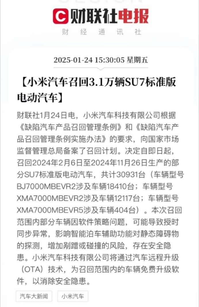 小米今天官宣召回2024年2月至2025年8月生产的116887辆SU7标准版,原因是L2高速领航辅助驾驶在极端场景下,识别、预警或处理能力不足,可能增加碰撞风险,解决方式是OTA升级辅助驾驶功能。