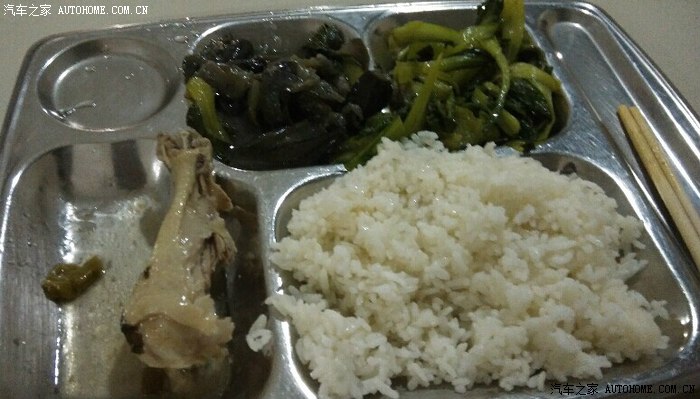 这一番折腾要吃饭了,4s给张饭票,一荤两素,分别是鸡腿、青菜、茄子、米饭,免费冬瓜汤。味道不错,下次保养还要去吃