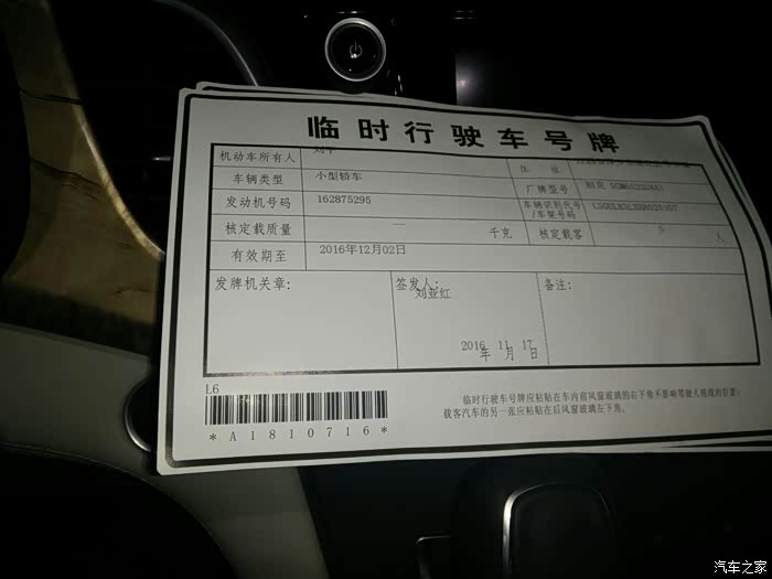 这是购买车当天2016年11月17日办的临牌,有效期到12月二日